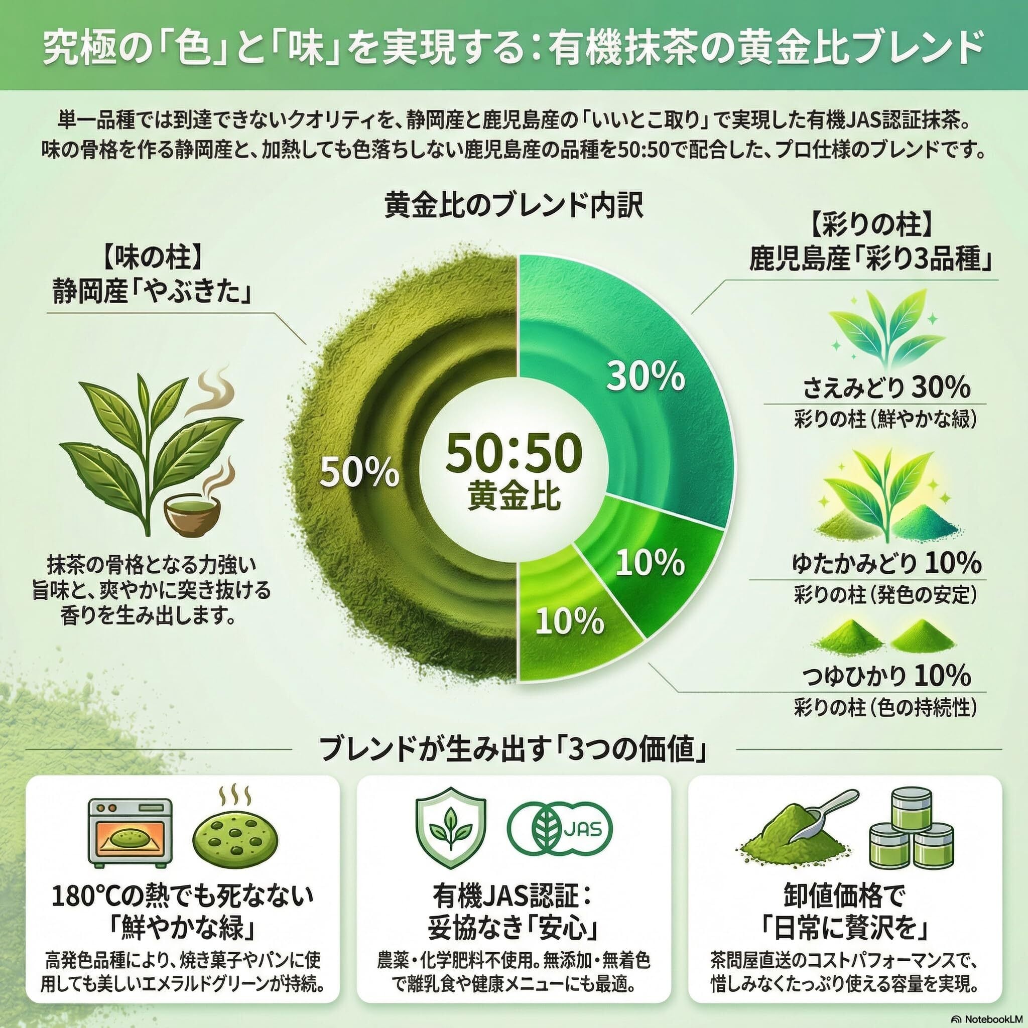 日本の厳しいオーガニック基準をクリアした茶葉のみを使用。無添加・無着色はもちろん、栽培から加工まで徹底管理されています。健康に気を遣う方や、お子様の離乳食・おやつ作りにも安心してお使いいただけます。
